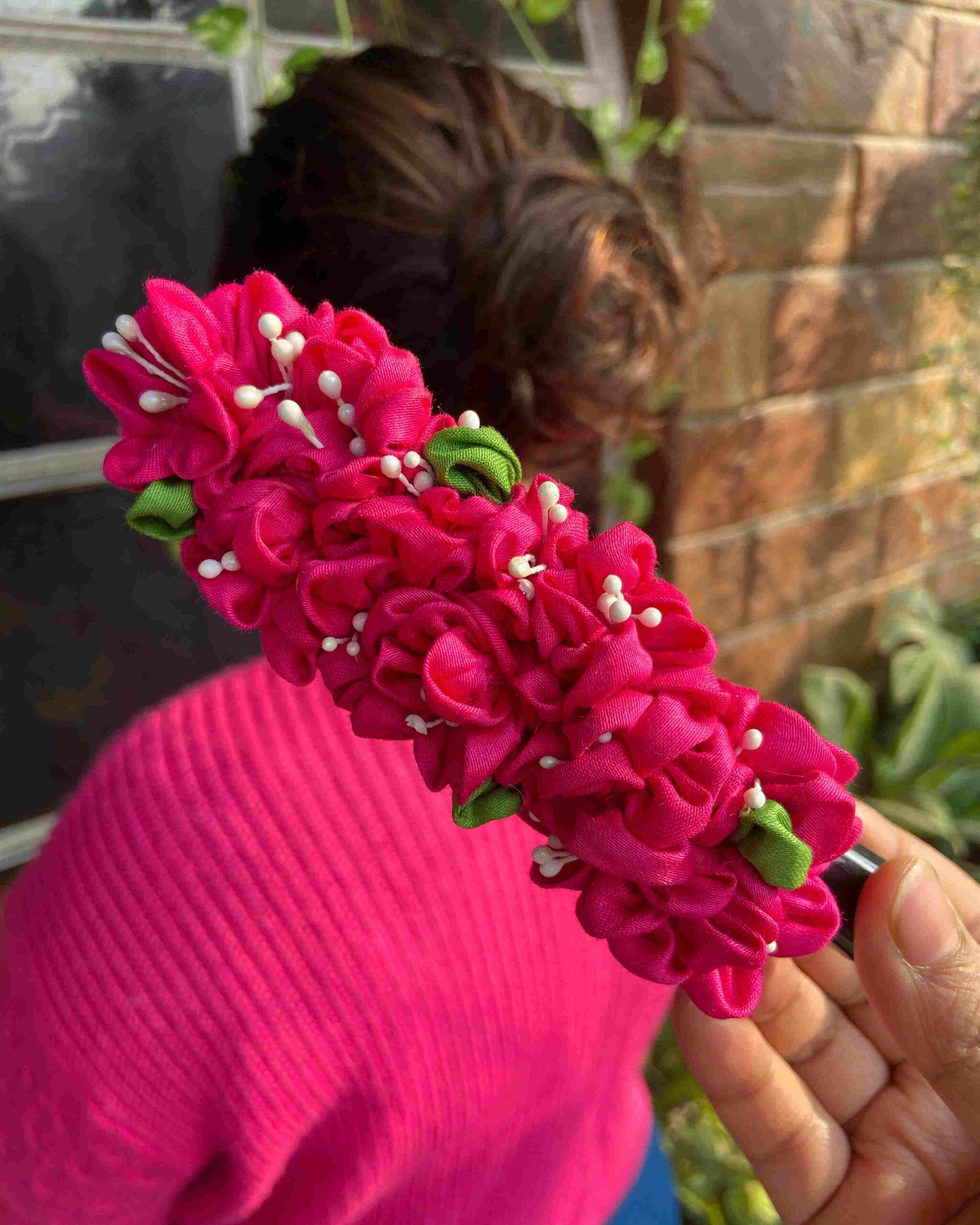 Introducing Chandni Claw Clip, a mesmerizing accessory that seamlessly merges elegance with a vibrant flair. Crafted from an exquisite array of three dozen hand-stitched fabric flowers in a striking hot pink hue, this claw clip serves as a definitive statement piece for any hairdo.