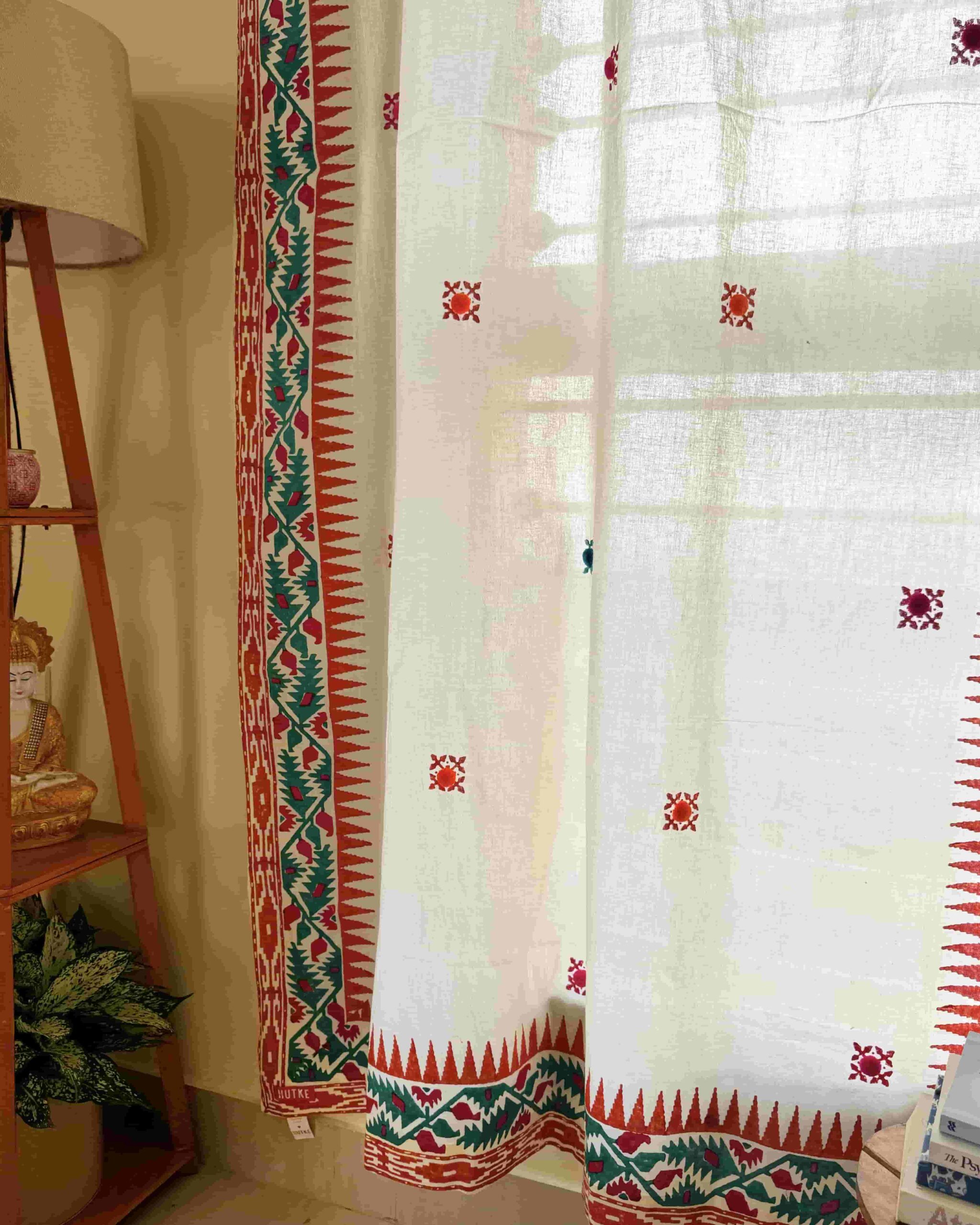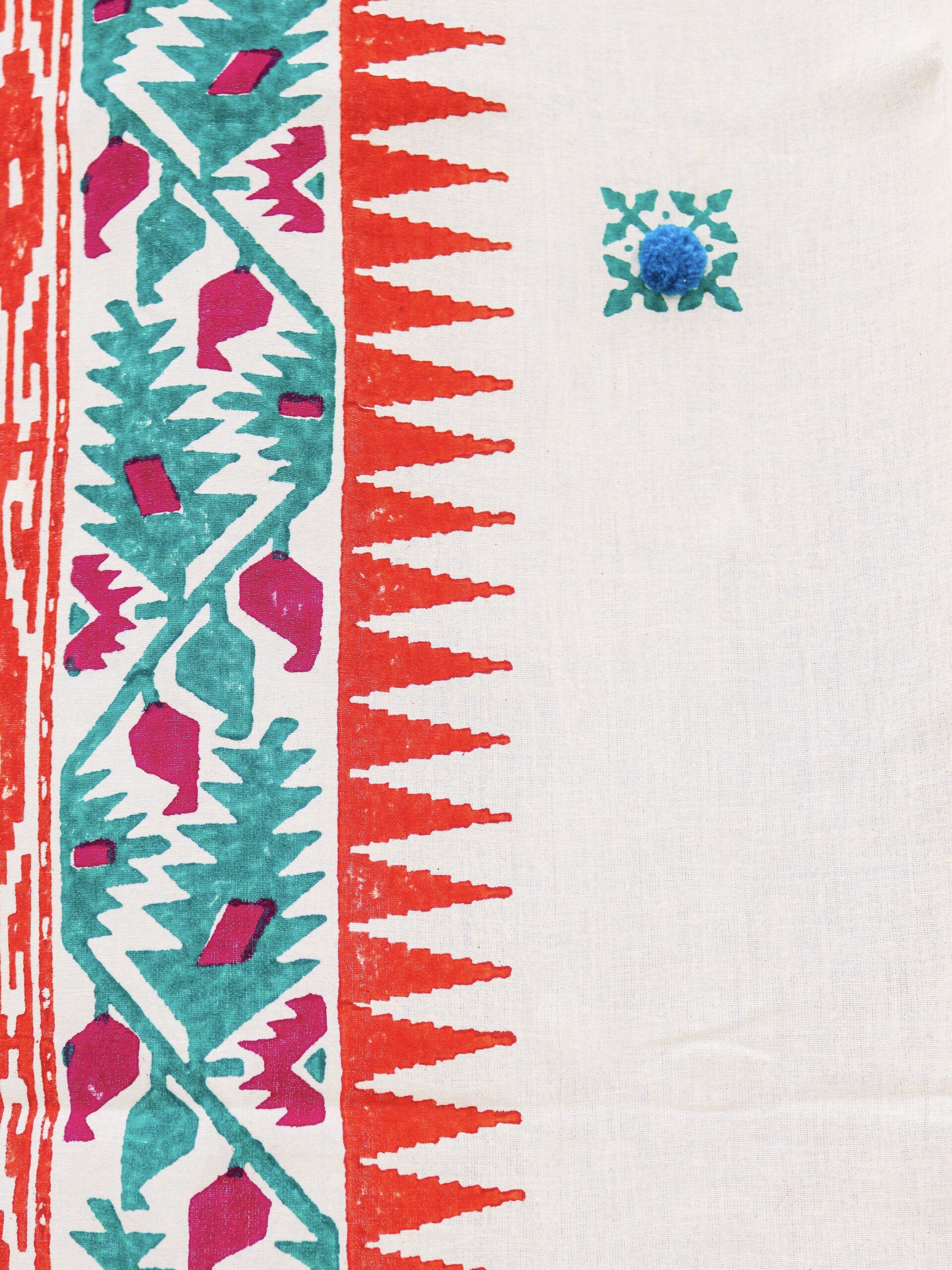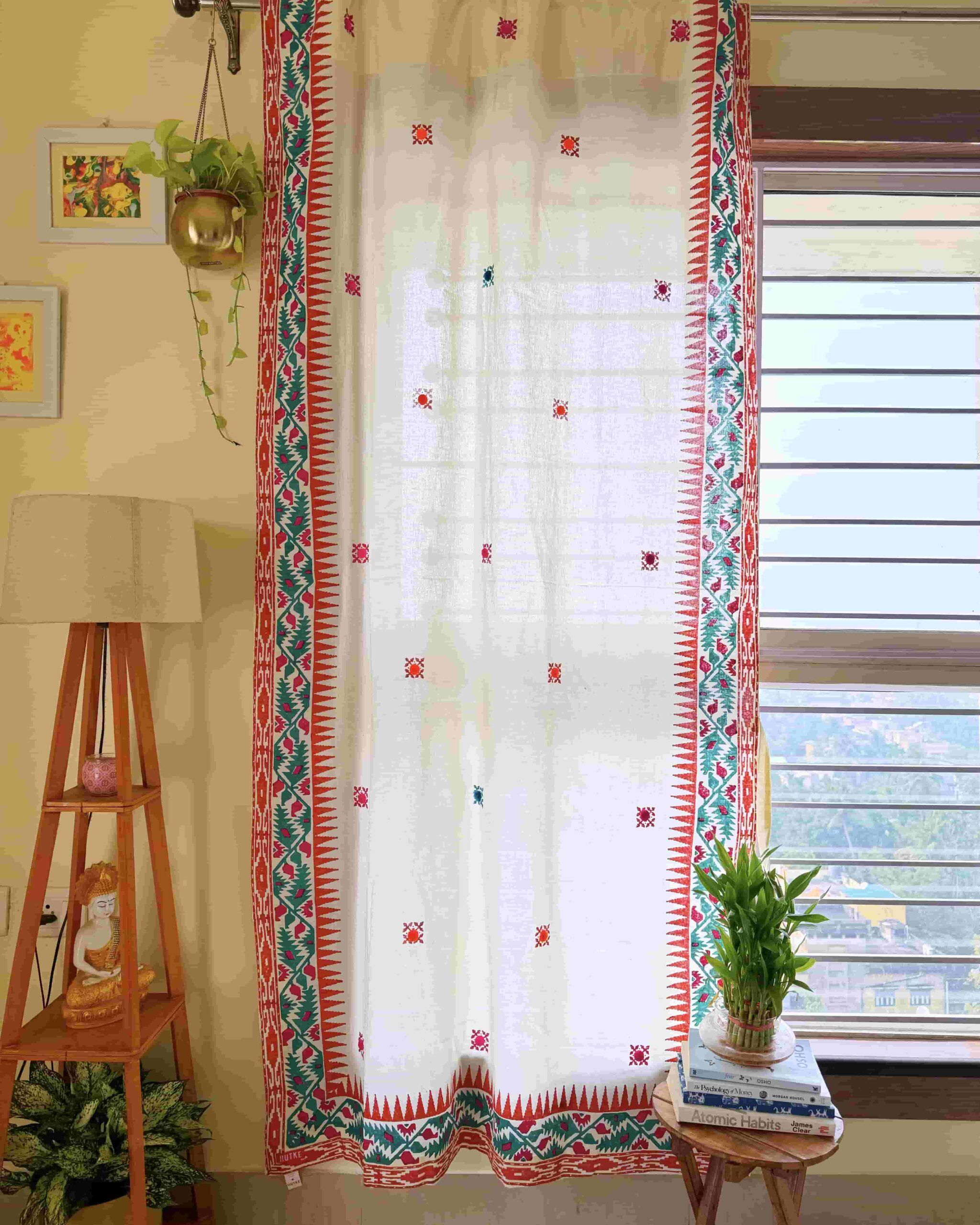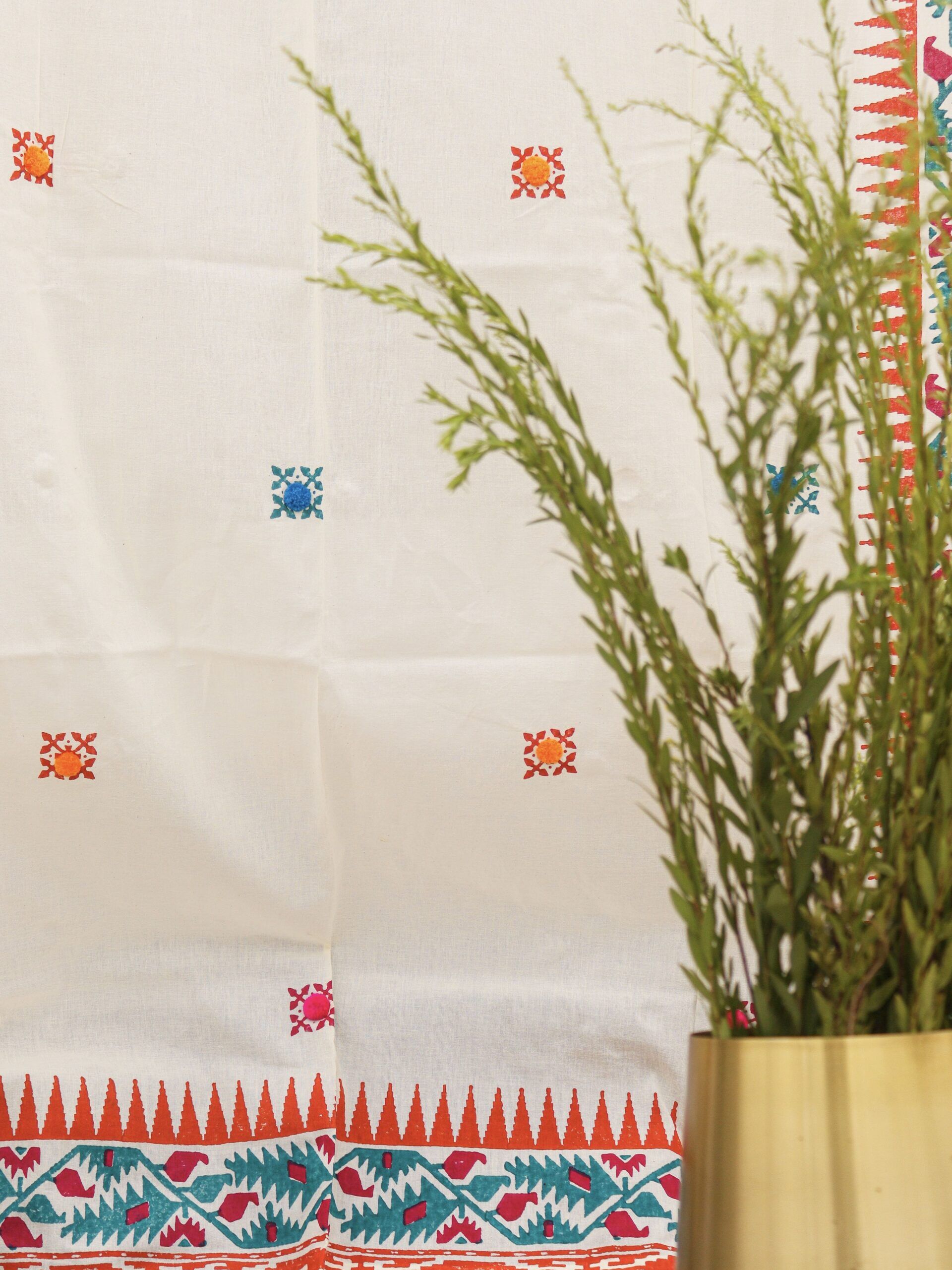 Our Jamdani curtains are here to give your home a touch of Bengal as Jamdani fabric is a heritage of Bengal. Hand block printed Jamdani motif is finished with cute pompoms making it an absolute stunner. The premium quality fabric is sourced from Phulia, the land of Handloom fabric.