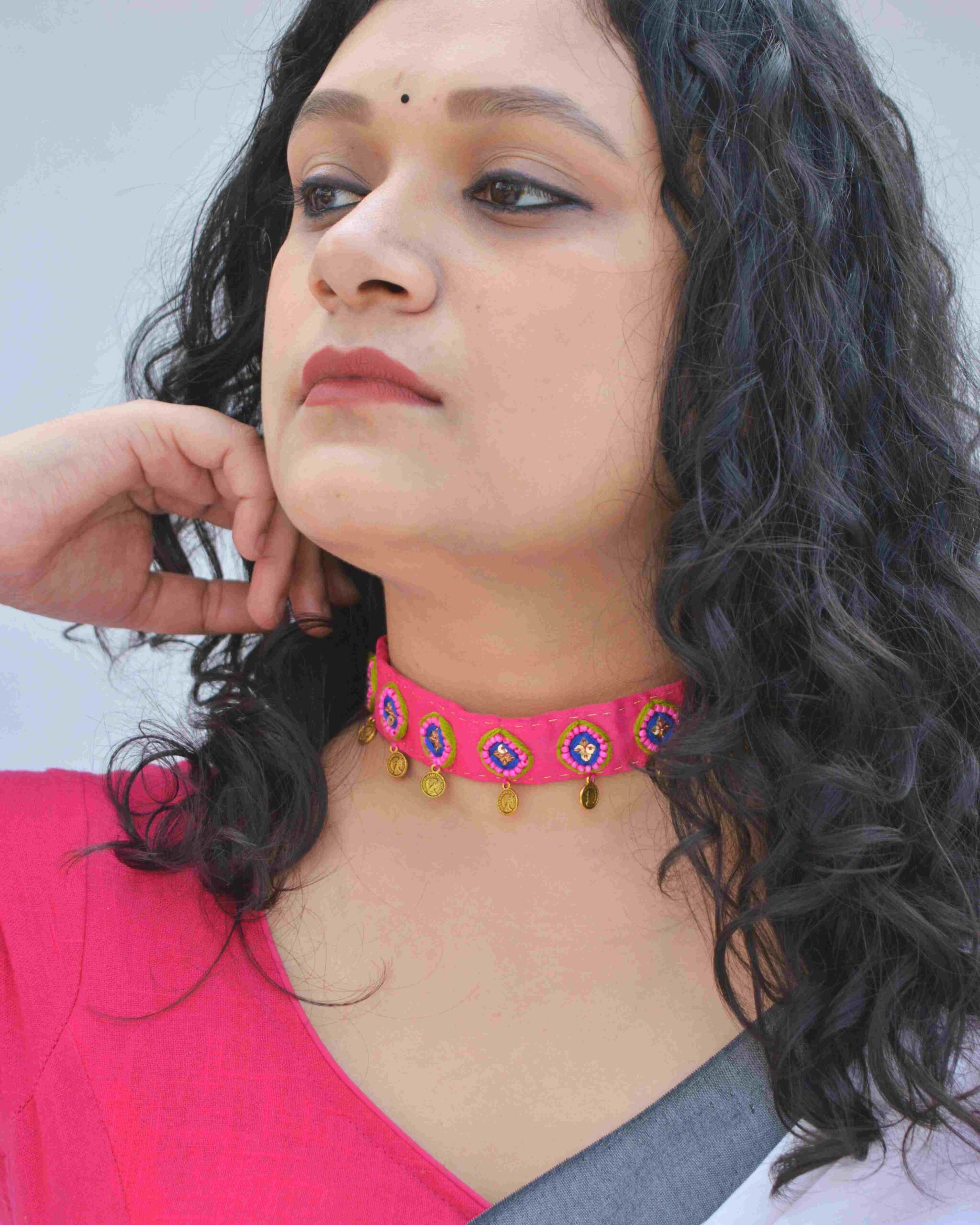 Introducing the Kaju Katli Choker, a meticulously hand-curated piece that embodies both elegance and bold artistry. This striking choker features intricate embroidery and exquisite beadwork, showcasing a vibrant color palette that effortlessly elevates any ensemble. Whether paired with traditional attire or contemporary outfits, the Kaju Katli Choker stands out as a true statement piece, captivating attention and igniting admiration.