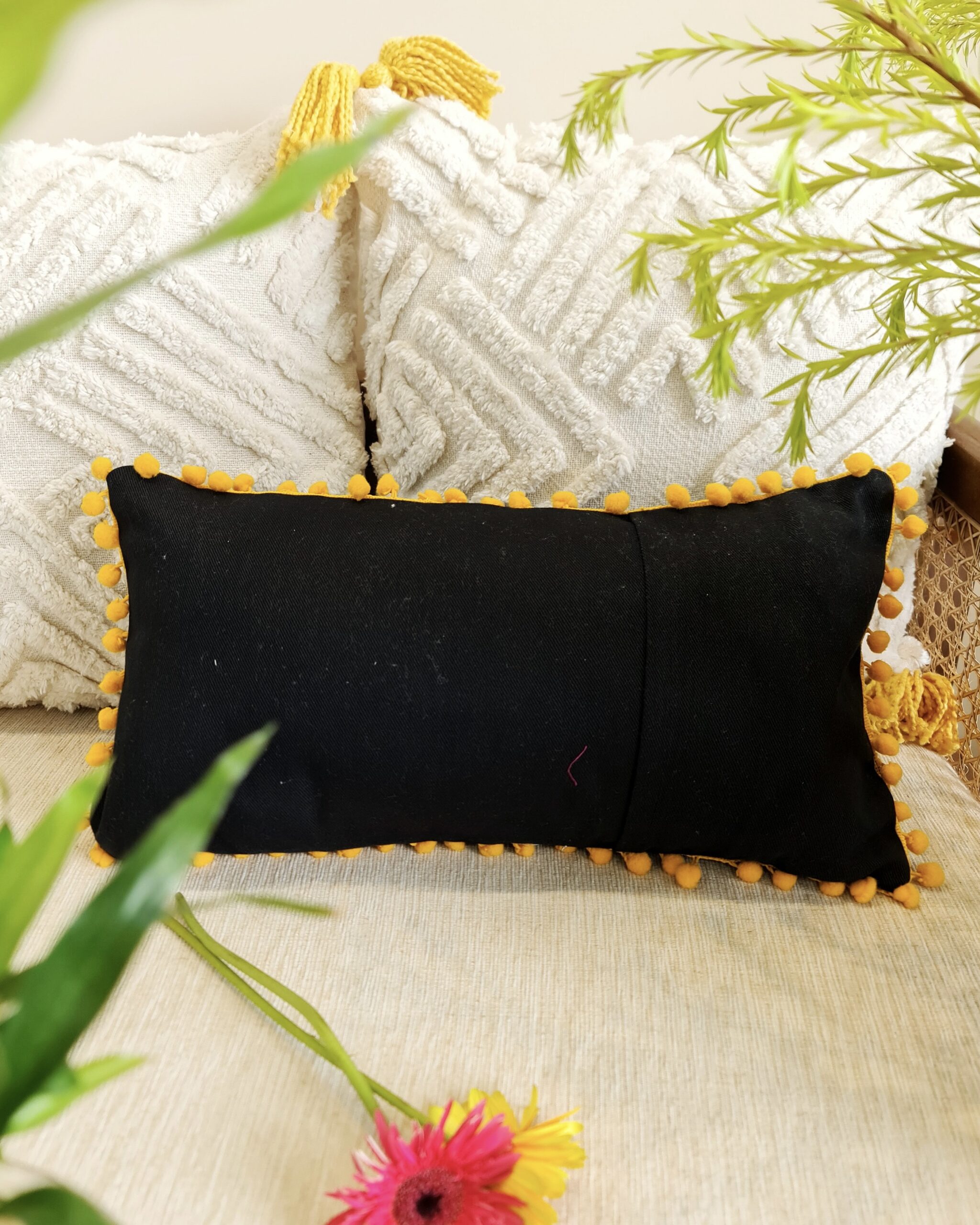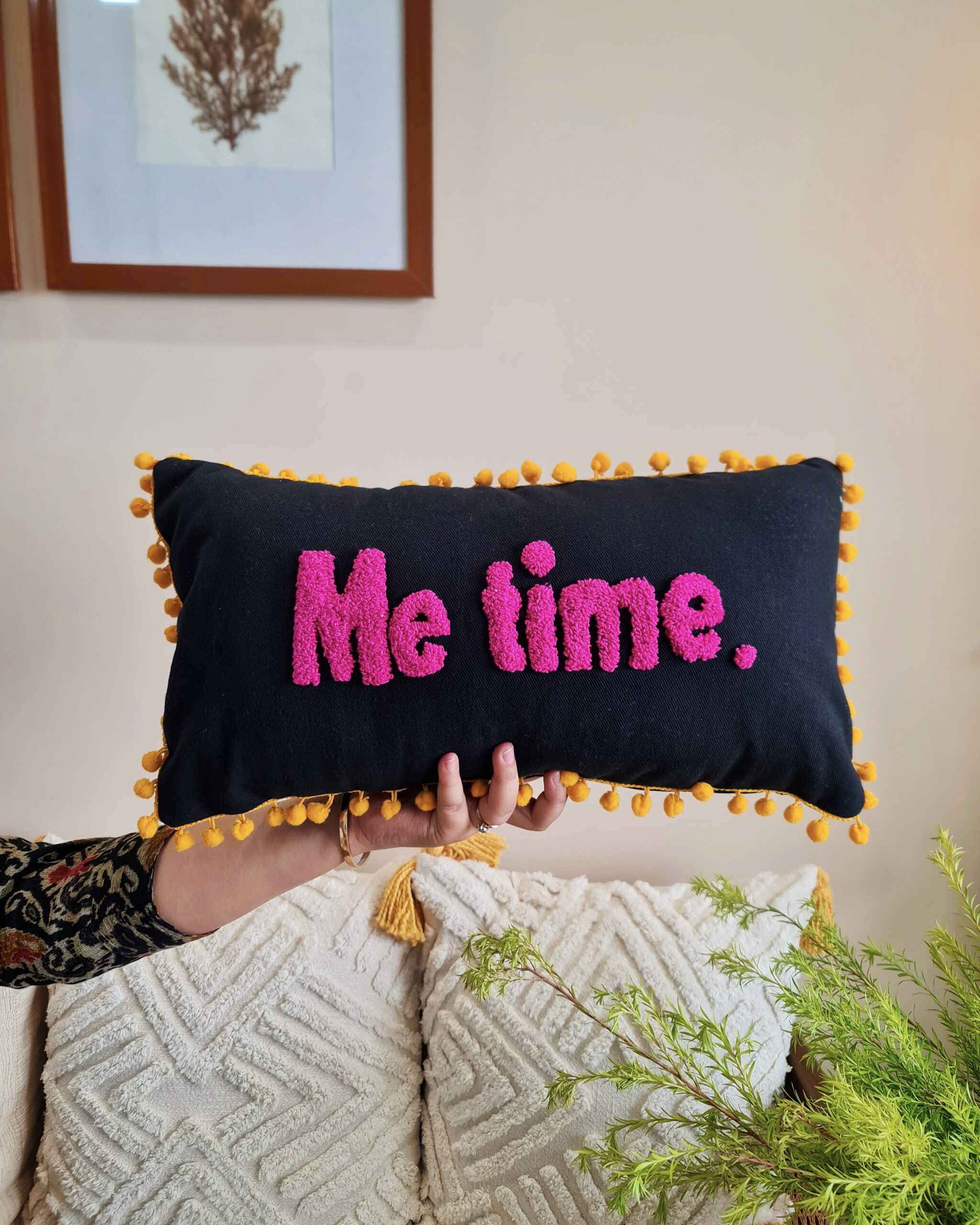 For all the precious moments you spend with yourself this cushion will be your companion. Add quirk to your living space and set up that corner where you would love to spend your time alone, with our cushion. Intricately hand stitch with punch needle embroidery and finished with lacey pompoms.