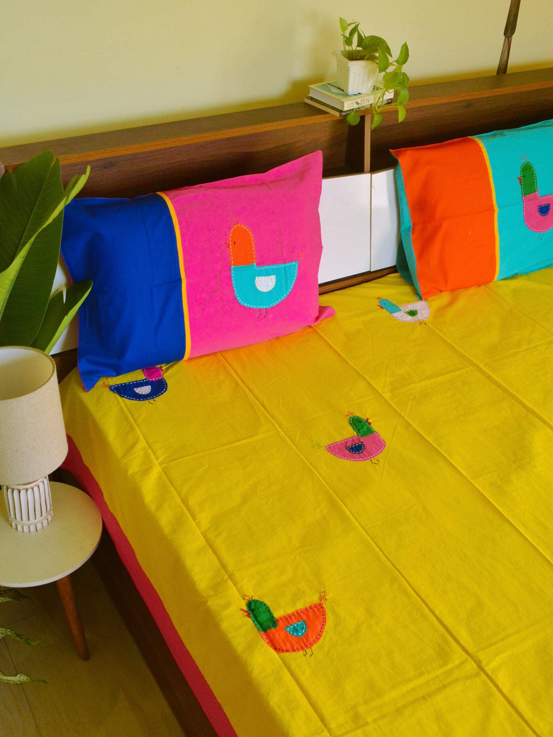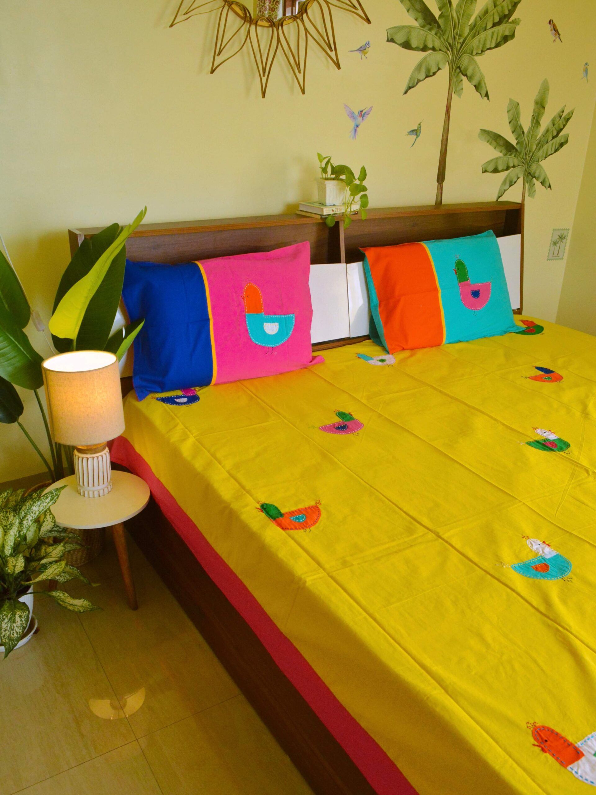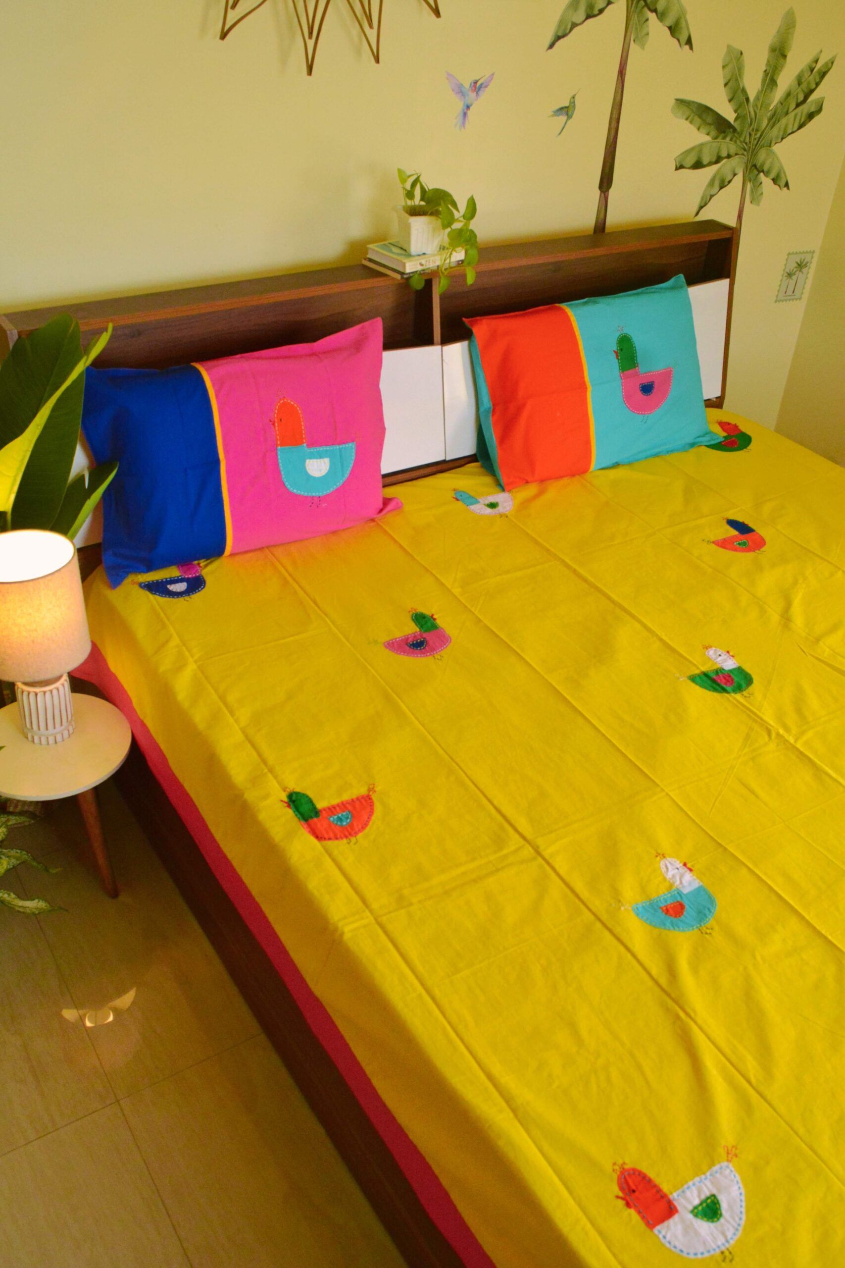 Cluck, cluck, cozy! Meet Morag, the handcrafted bedsheet set that’s all about adding a little farm-fresh fun to your bedroom. We’ve decked out this beauty with a flock of adorable, appliqued hens, each one crafted from a rainbow of colorful fabrics. But we didn’t stop there! The pillows are super contrasty and bursting with flashy colors, guaranteeing a pop of personality. And to tie it all together, we’ve added borders to the edges of the bedsheet for a complete, polished look. Morag isn’t just a bedsheet; it’s a statement. Get ready to snuggle up with some serious style!