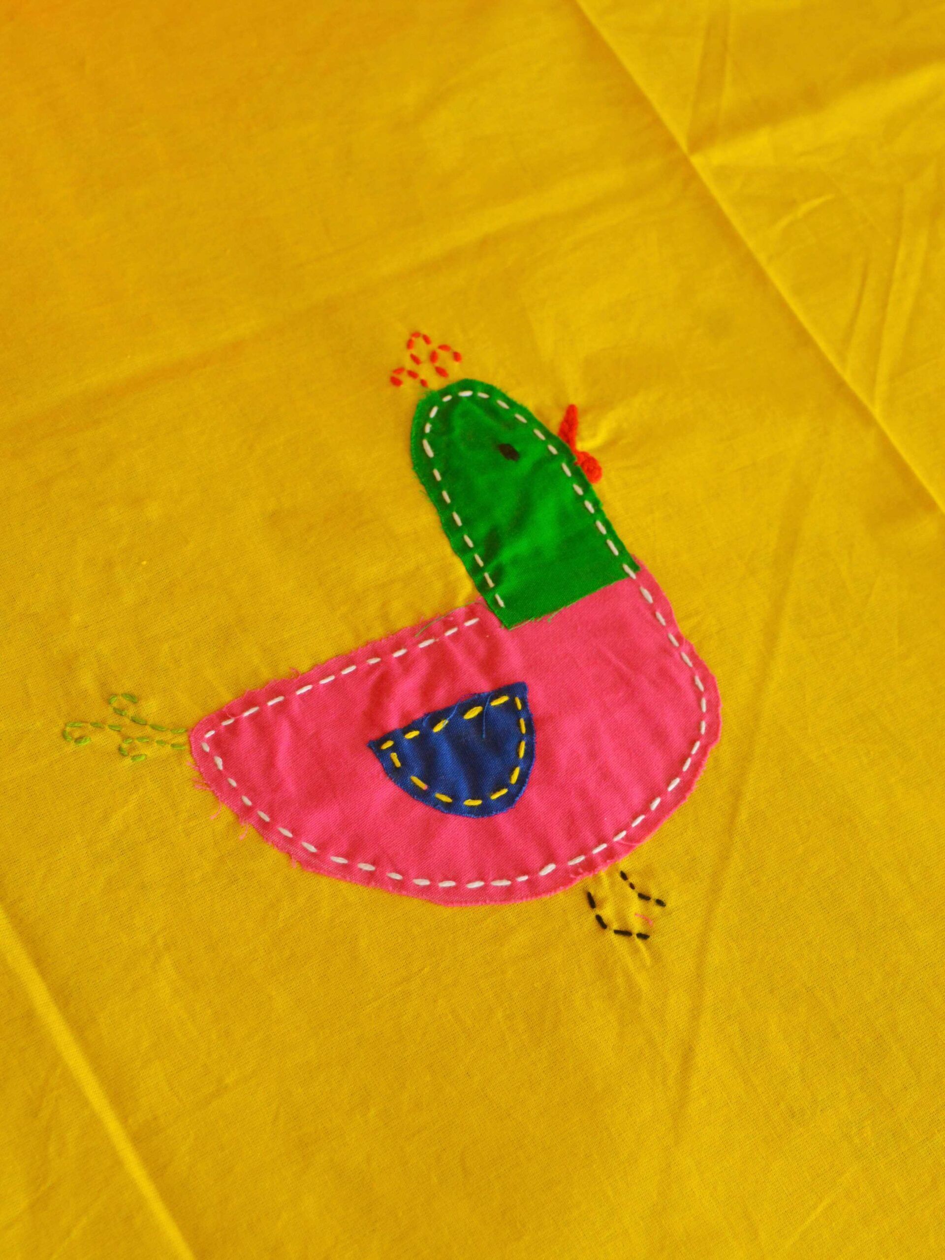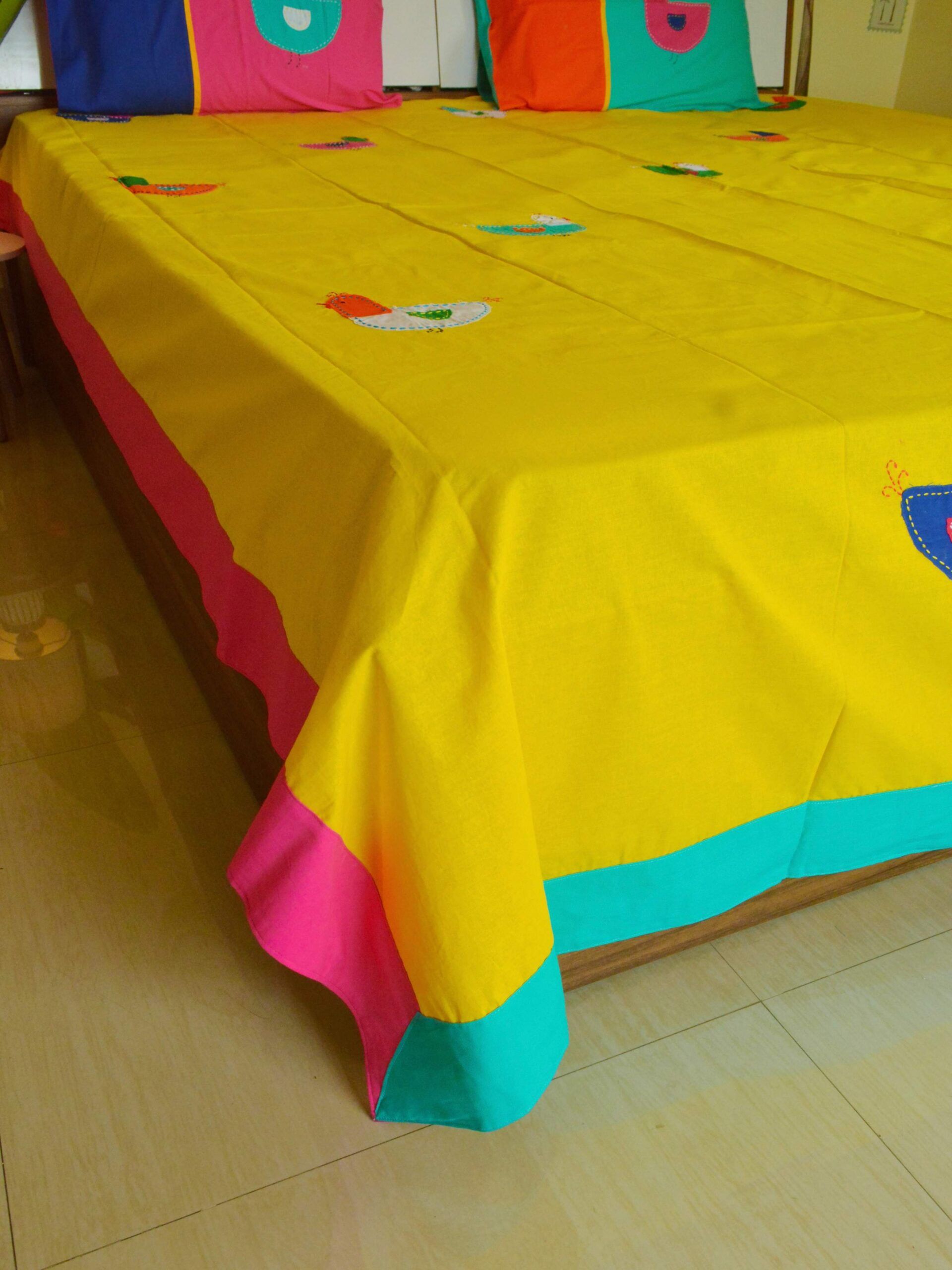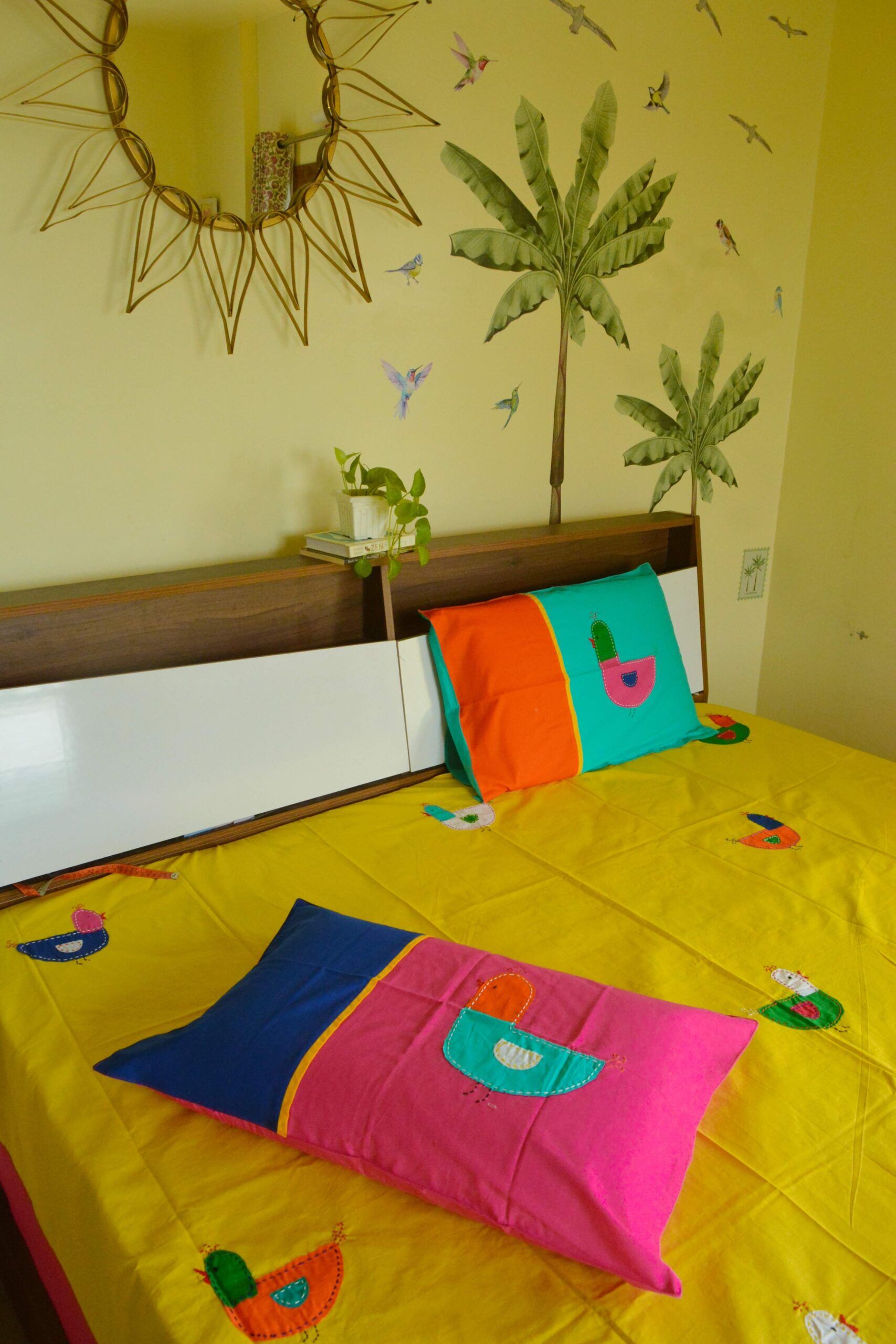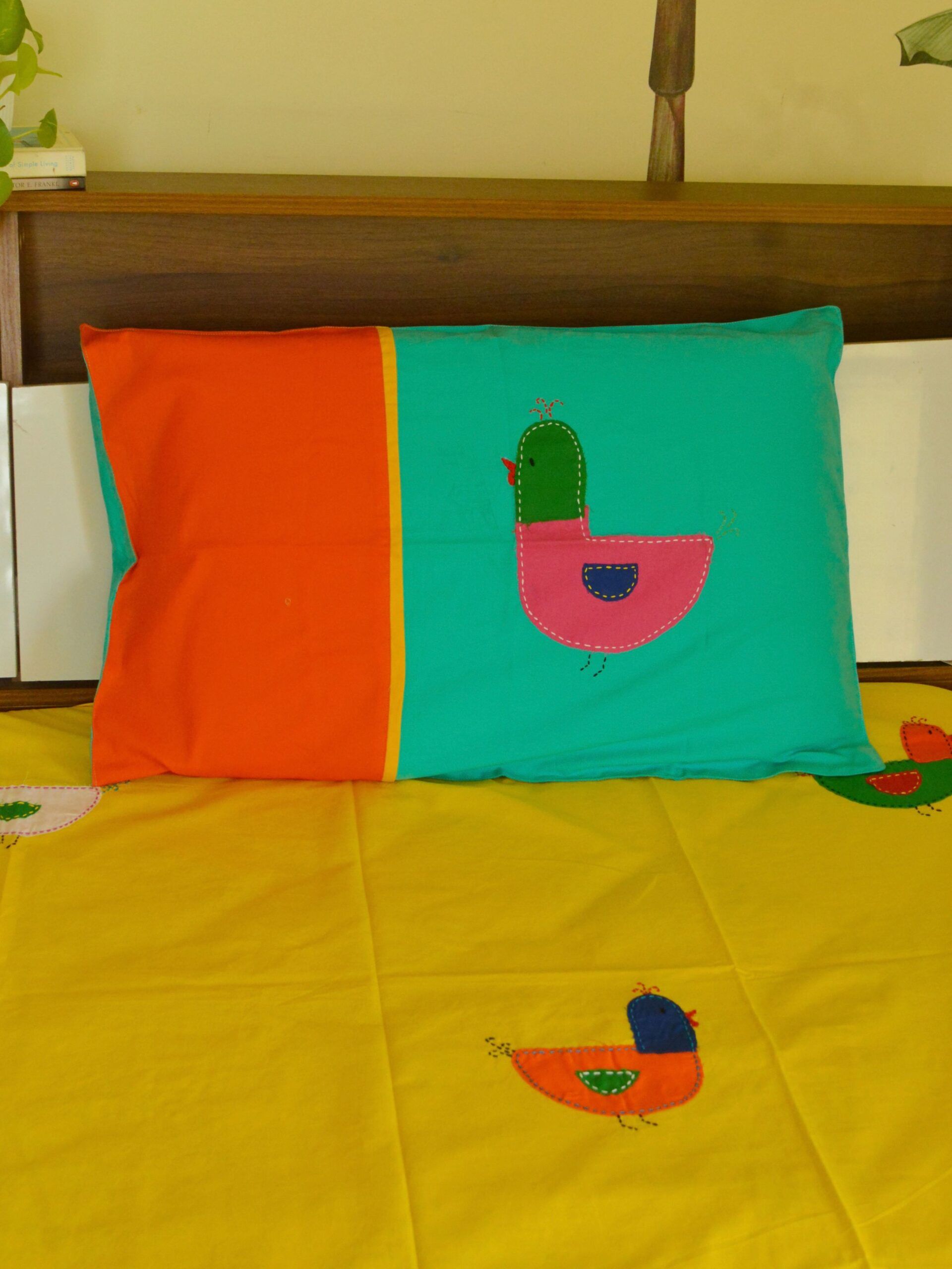 Cluck, cluck, cozy! Meet Morag, the handcrafted bedsheet set that’s all about adding a little farm-fresh fun to your bedroom. We’ve decked out this beauty with a flock of adorable, appliqued hens, each one crafted from a rainbow of colorful fabrics. But we didn’t stop there! The pillows are super contrasty and bursting with flashy colors, guaranteeing a pop of personality. And to tie it all together, we’ve added borders to the edges of the bedsheet for a complete, polished look. Morag isn’t just a bedsheet; it’s a statement. Get ready to snuggle up with some serious style!