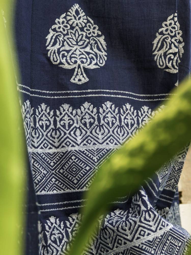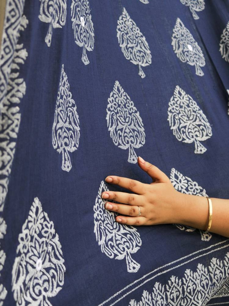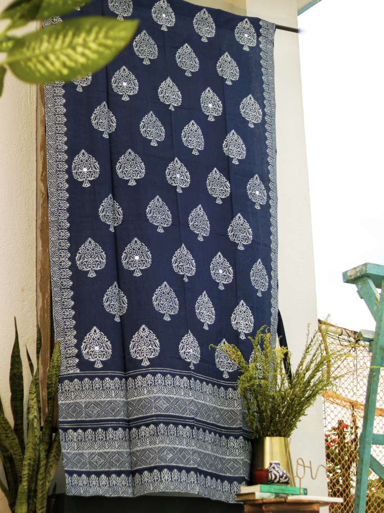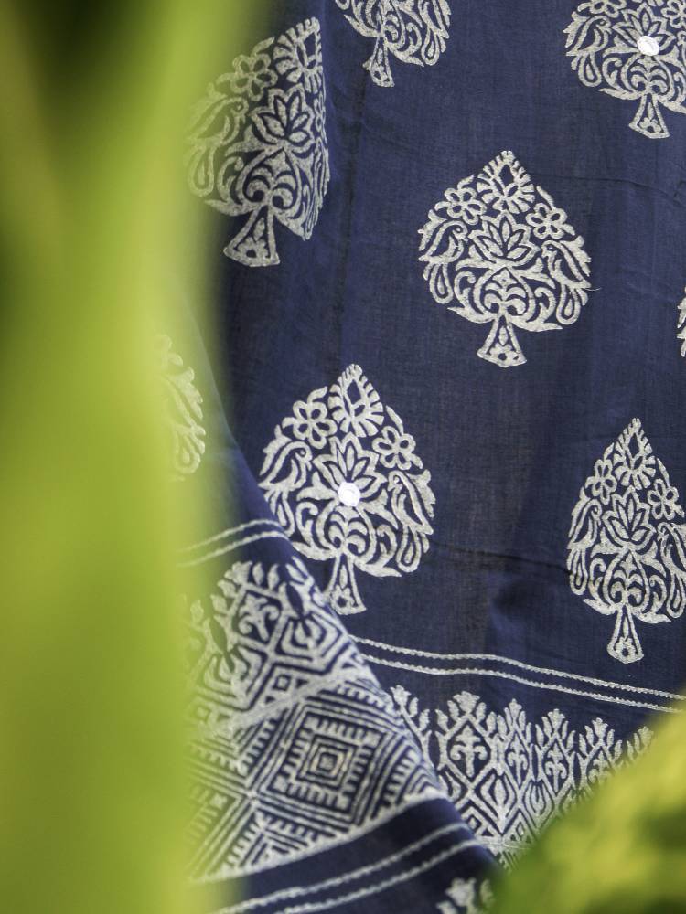 Hand Block printed Paan motif with Mirror work here and there is prim, pragmatic and poised to help you start your day with a refreshed spirit.. The premium quality fabric is sourced from Phulia, the land of Handloom fabric.